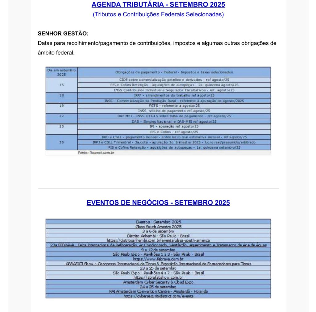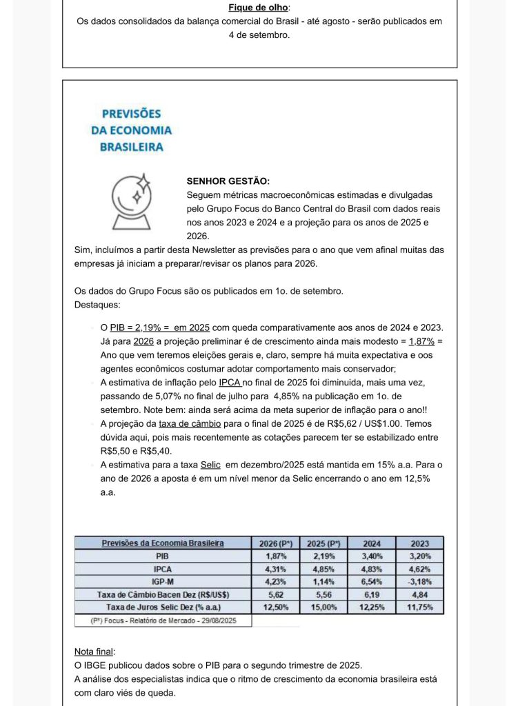 Home»NEWSLETTER»Newsletter Setembro 2025 NEWSLETTER Newsletter Setembro 2025 por Jose Rubens Vicari em 3 de setembro de 2025 / 0 Comentários You may also like Newsletter Março 2026 A capacitação das pessoas e a produtividade A indústria 4.0 está em curso, mas enquanto ela não se instala… Newsletter Agosto 2020 Empresa Familiar e Governança Corporativa. É possível e importante avançar mais! Cuidados necessários para financiar as atividades do negócio Deixe um comentário Cancelar respostaVocê precisa fazer o login para publicar um comentário.